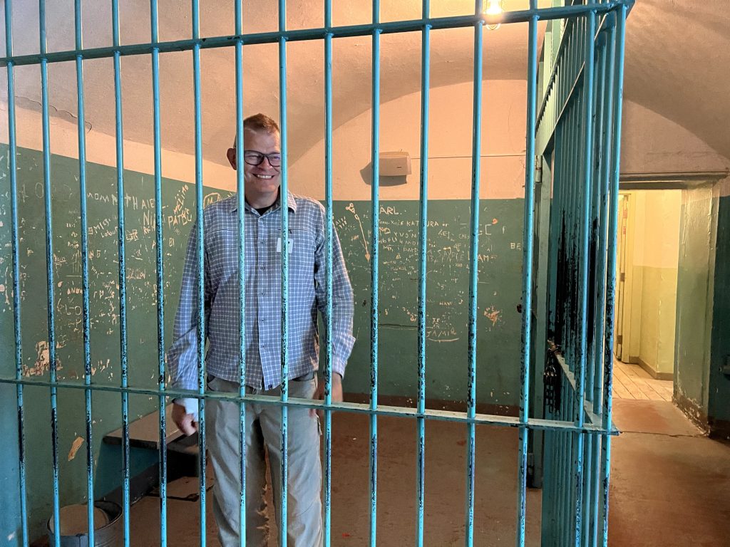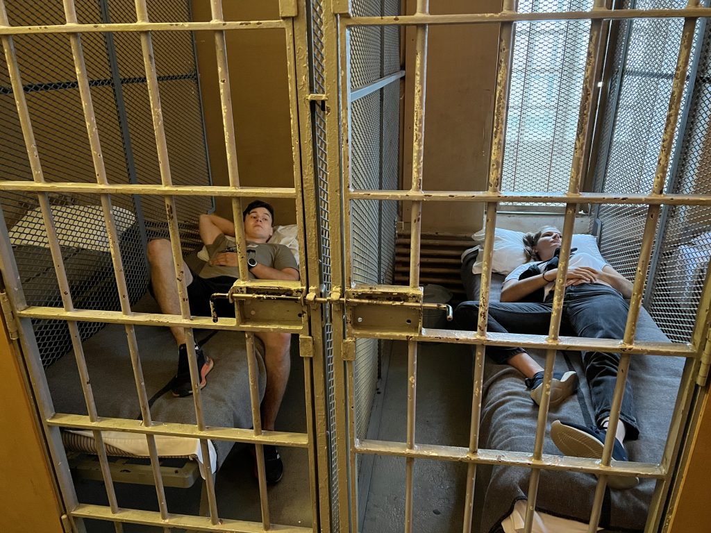 In Trois-Rivières hatten wir eine Führung auf Französisch im alten Gefängnis. Hat Papi verstanden, dass er in der Zelle der U-Haft gelandet ist? Immerhin ist er alleine. Früher waren da bis zu 20 Personen drin. Für kleinere und grössere Geschäfte stand der Eimer in der Ecke unten-links zur Verfügung.
