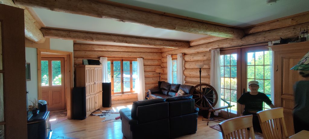 Das Wohnzimmer von innen. Dies ist übrigens das erste bewohnte Blockhaus aus ganzen Holzstämmen, welches ich gesehen habe. Entgegen unserer Erwartungen leben die Menschen hier sehr oft in Häusern, welche viel mehr an amerikanische Bauweisen erinnern: dünne Querschnitte, kleine Rasterabstände.
